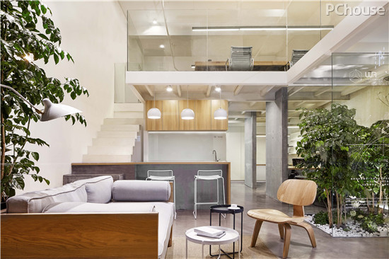 设计说明:相对周围的沿街商业办公区域,这个郁郁葱葱的办公室犹如沙漠里的一颗橡树。穿过东南入口的一片室内“竹林”,挑空的公共休闲区域,沙发、茶几、吧台、落地窗给人一种“宾至如归”的感觉。另一方面,1层的独立办公区域被隐藏在植物后,办公区视野尽端为精心营造的室内景观。会议室则被安置在最深处,整个空间强调了温馨的生活理念,而弱化办公空间的紧张性和冷漠性。