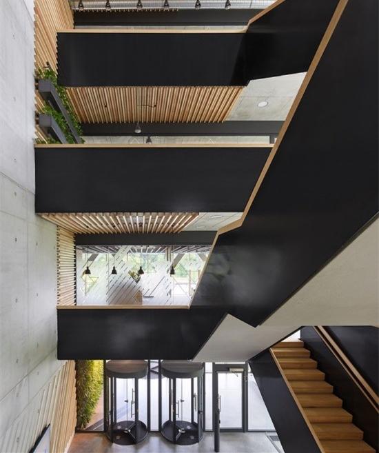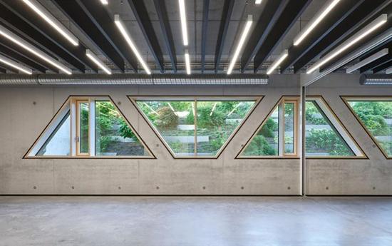 内部的设计就像一个开放式的飞机坪,封闭式的混凝土核心位于室内中心,里面承载了各种服务于技术设施,如急救楼梯、电梯、技术基础设施和卫生系统。再由中心向外打通了所有楼层,由裸露的混凝土,钢材以及亚光黑橡木板层打造的楼梯与各楼层相连,整个空豁然开朗。