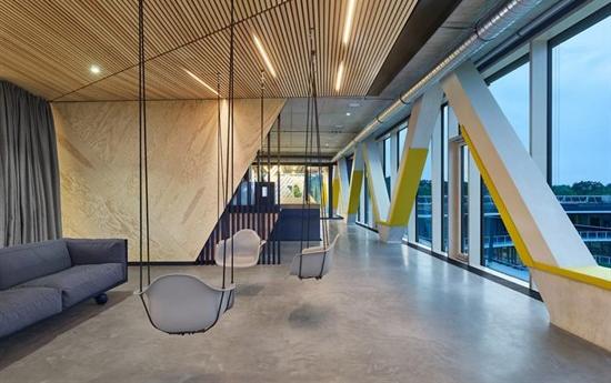 整座办公空间的天花板照明和绿墙设计都十分抢眼,工业管道、原木材、皮座椅、种植箱甚至是充满趣味的摇椅和柔软舒适的沙发,这种搭配和设计在视觉和触觉上与工业味道的裸露混凝土墙壁相互呼应形成对撞感,丰富的材料使用也为室内营造了良好的声学特性,整洁的室内氛围简单利落,但又不会使人觉得沉闷。