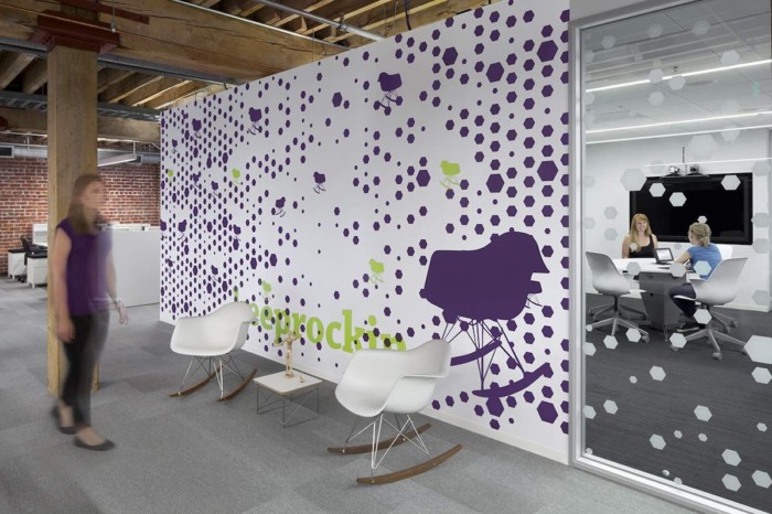 在办公室装修时,在墙面上设计一些标语或者图标也是企业文化展现的一种形式,这样会让员工产生企业认同感,并且能够活跃空间氛围,这是一个很好的设计。