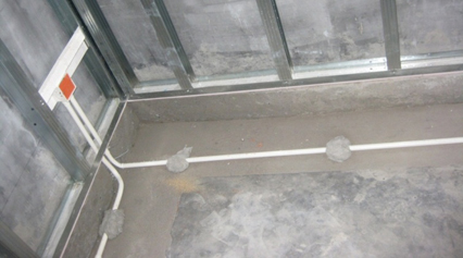 隔墙底座防潮工艺在湿区进行轻质隔墙施工时,为阻隔地面湿气对隔墙的影响,采取地面混凝土止水带工艺,并采用镀锌轻钢龙骨作为隔墙基层,确保墙体无霉变与乳胶漆脱落。
