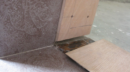 门套基层防潮工艺新建隔墙与地面的湿度不一样,现场制作门套时,需要在门套与新建墙体间设置防潮膜、喷涂木材防水剂,茶水间的门套基层板需要离地15mm以防止水气侵蚀