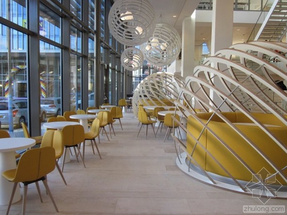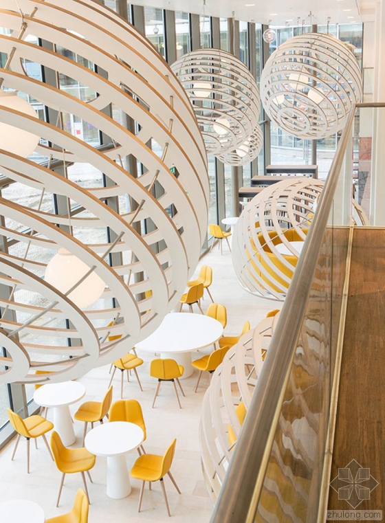 在大楼的进门处,人们可以通过那个三层楼高的休息大堂,看到建筑内的大致状况,一架复杂的楼梯将所有的楼层都联系起来。这里的主色调是中性的亮色,包括白色的墙壁、天花板、家具以及浅色的木质地板,这一切都让整个空间显得无比温暖。空间里的一些地方好像被溅上去的蓝色、黄色和绿色斑点,又恰到好处的打破了整体那种简洁的略显沉闷的浅色,给这里带来一丝有趣和俏皮的动态感。