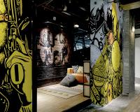 以蓝色系与橘色系为主的色彩搭配,表现现代与传统、古与今的交会,碰撞出兼具现实与复古风味的视觉感受。这两种色彩能给予空间一种新的生命。