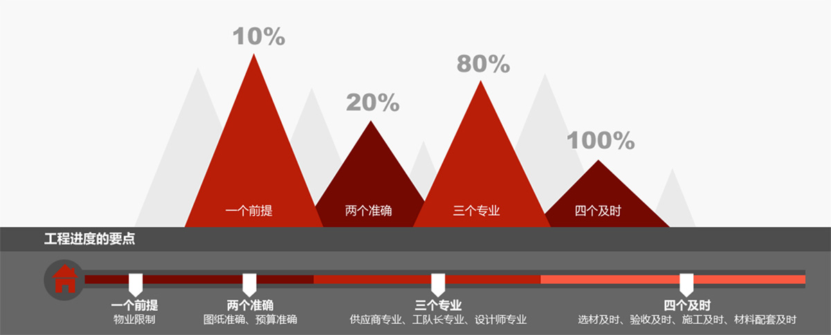 三个专业体现了装饰公司的内部管理标准的执行情况:供应商、设计师、工队长任何一方的不专业均可大大的降低工程效率;明祺建设通过严格的内部标准,宁缺毋滥的专业的为客户服务着。我们每周四晚上,是我们的培训之夜。反复的为施工人员、设计人员、材料供应商进行培训,教学相长。通过经验的分享与案例的分析,不断提升自我专业,来确保工期准确。